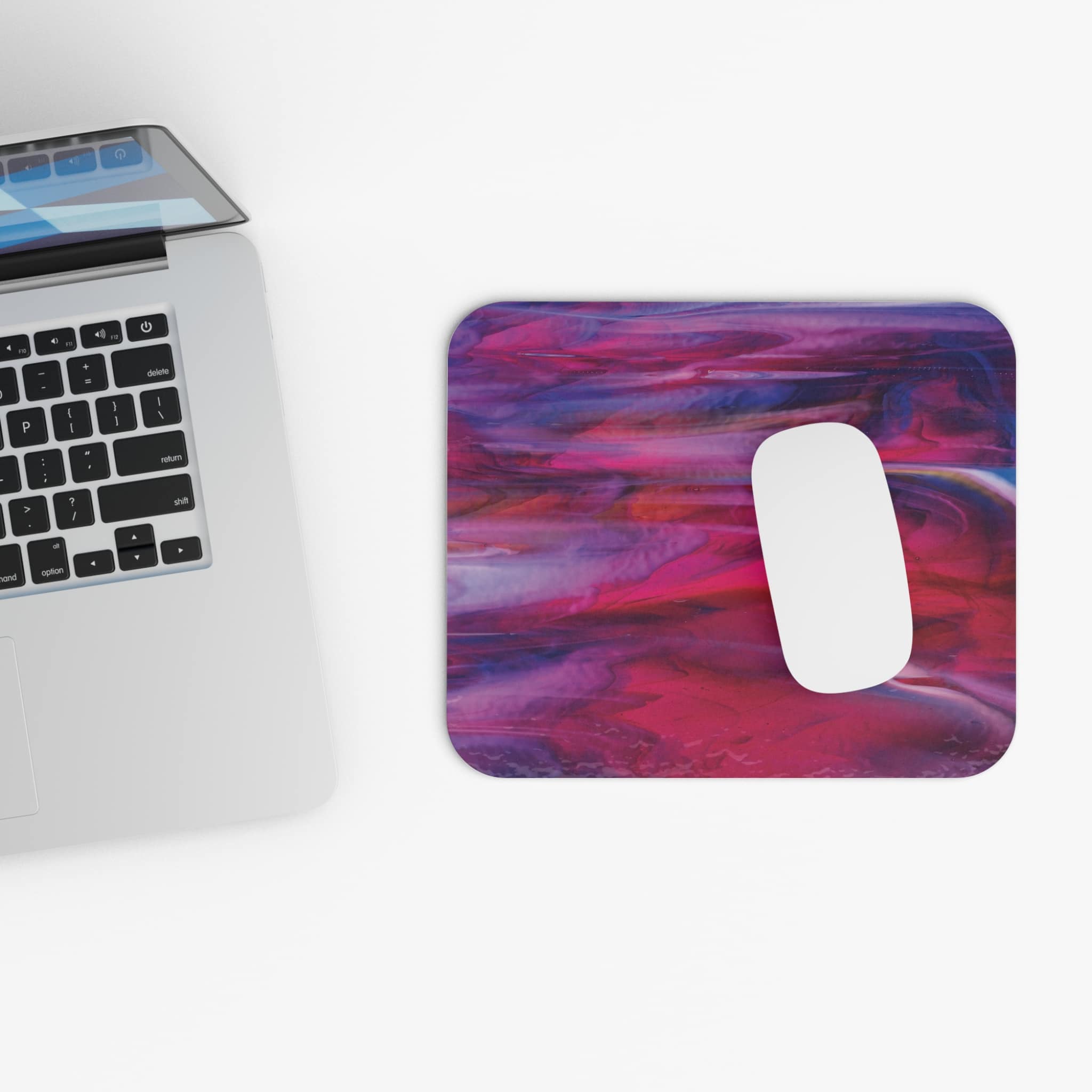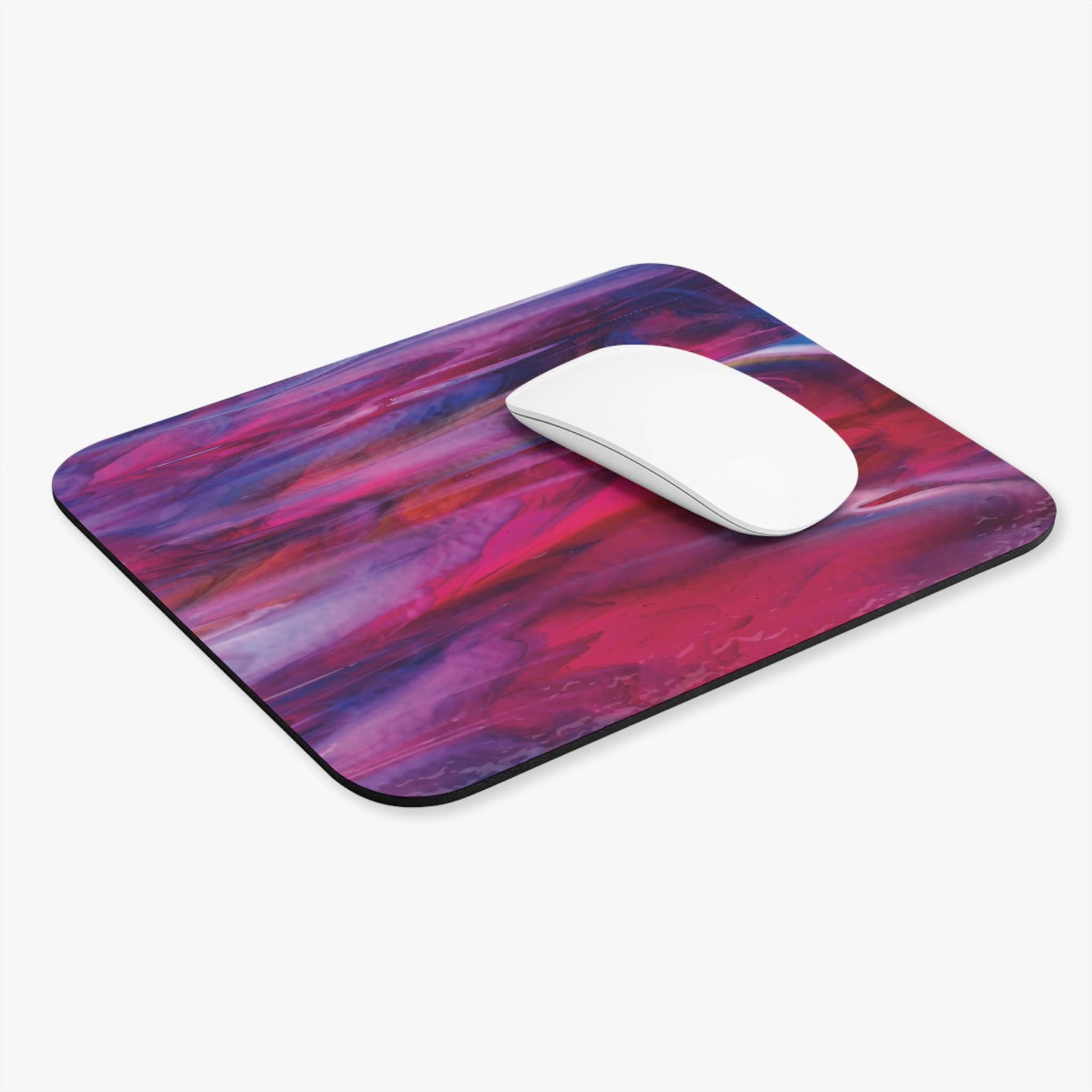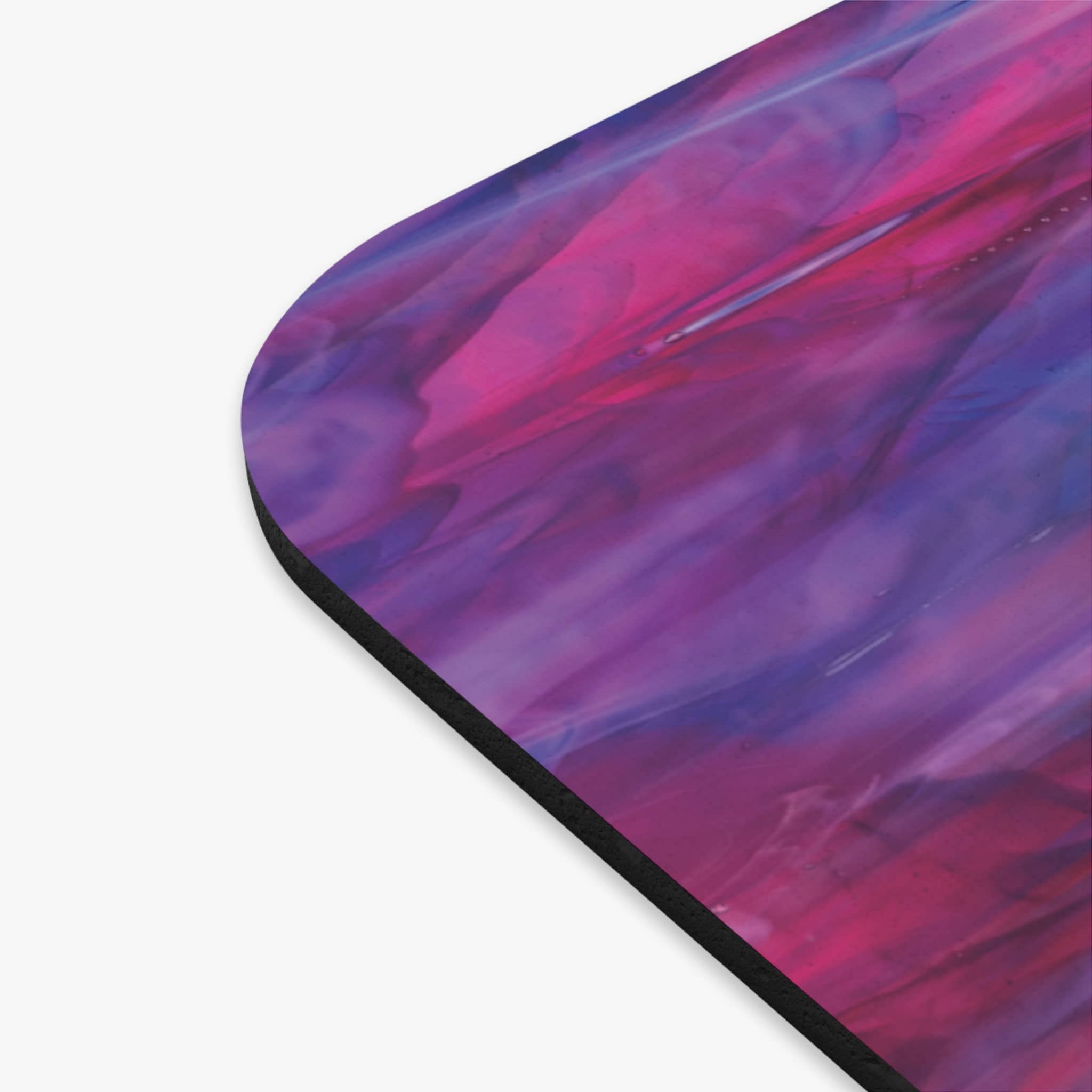 A richly colored rectangular mouse pad that brings painterly glassy energy to your desk. The surface shows vivid magenta, violet, and indigo swirls that catch the eye without shouting. It feels smooth under the hand and mouse, so long work sessions and precise cursor movements both flow easily. The low-profile foam with a thin rubber base sits flat and secure on wood or metal desks, while the one-sided, full-front print keeps the design bright and uninterrupted. Set it beside your keyboard to lift your workspace with a wash of color that feels creative and focused.