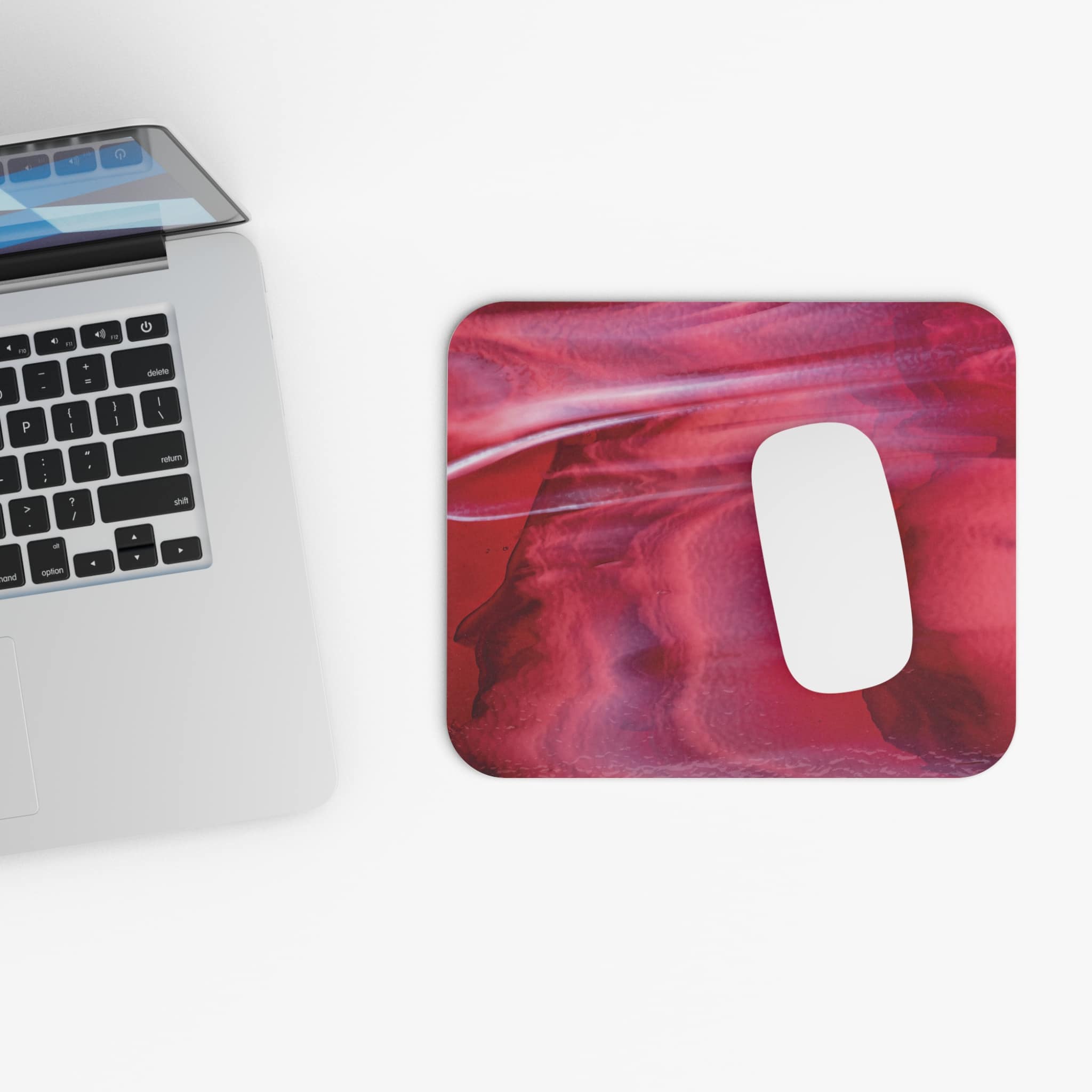 This rectangular mouse pad brings an artful, tactile accent to your desk. The surface carries a vibrant, painterly wash of crimson and rose tones that look like flowing ink or marble—warm, vivid, and full of depth. The smooth top lets your mouse glide with minimal effort while colors stay bright through daily use. A thin, grippy rubber base keeps the pad steady on wood, metal, or laminate desks so your cursor stays calm during focused work or late-night creative sessions. It’s slim and unobtrusive, slipping easily into a laptop bag or drawer when you’re on the move.